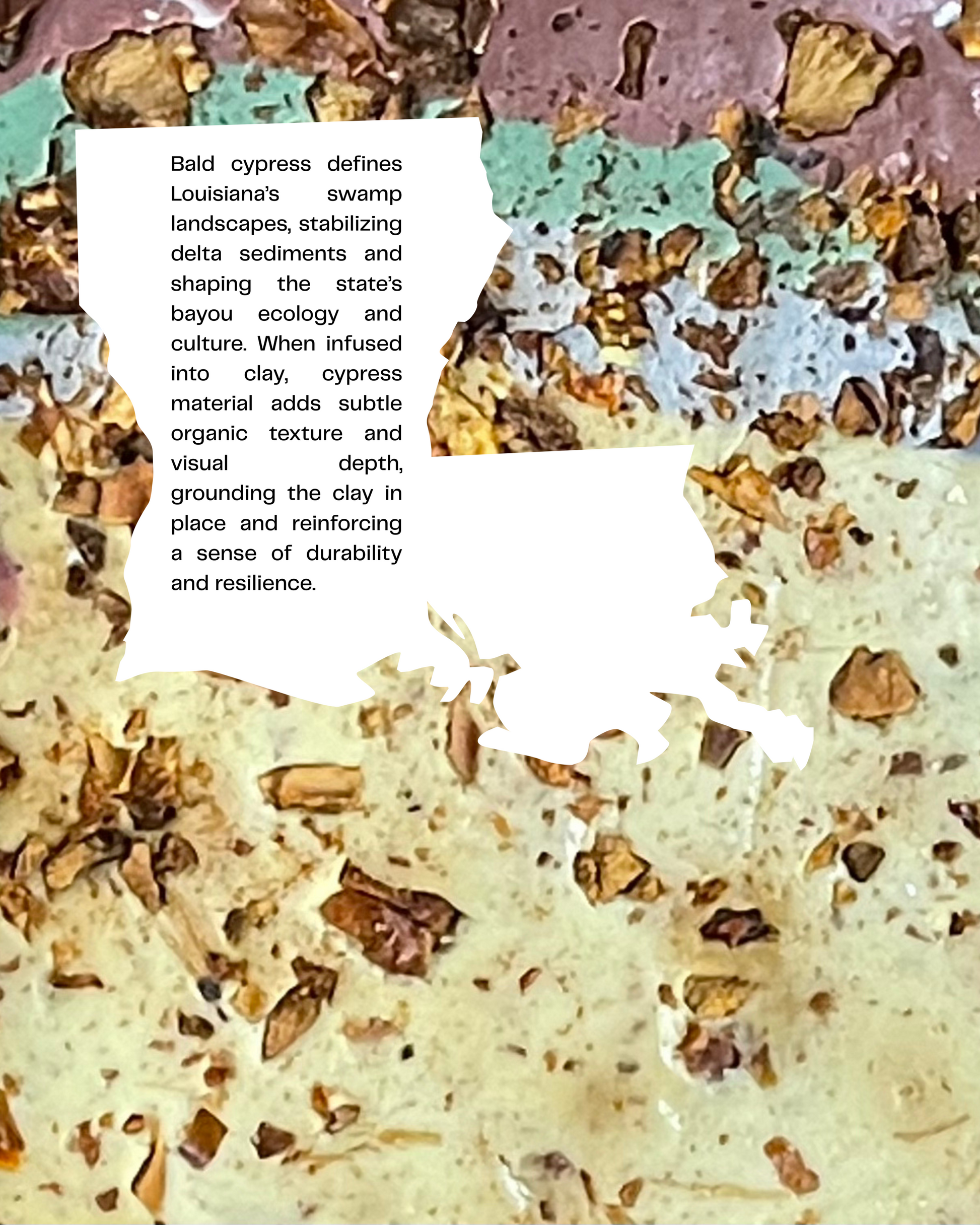 The clay is made with a blend of translucent Sculpey III, iron oxides for pigmentation, and natural pigmented fragments that were hand foraged and processed.