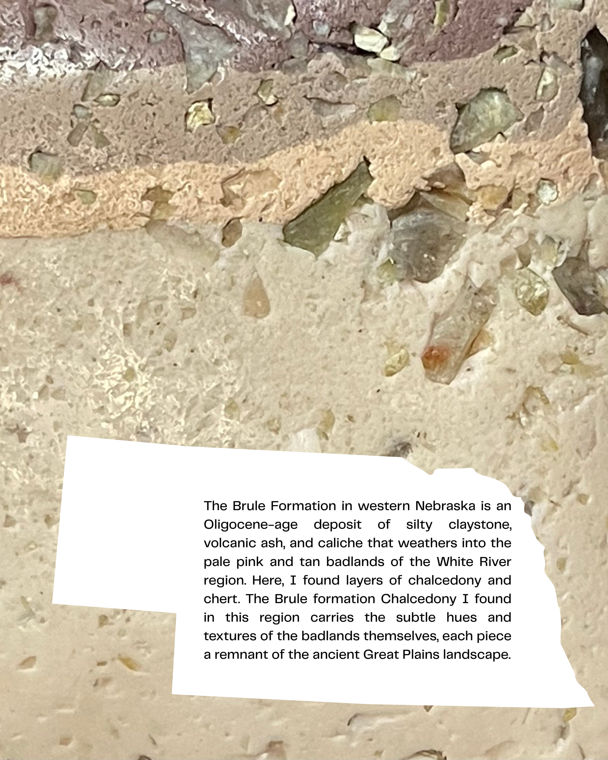 The clay is made with a blend of translucent Sculpey III, iron oxides for pigmentation, and natural pigmented fragments that were hand foraged and processed.