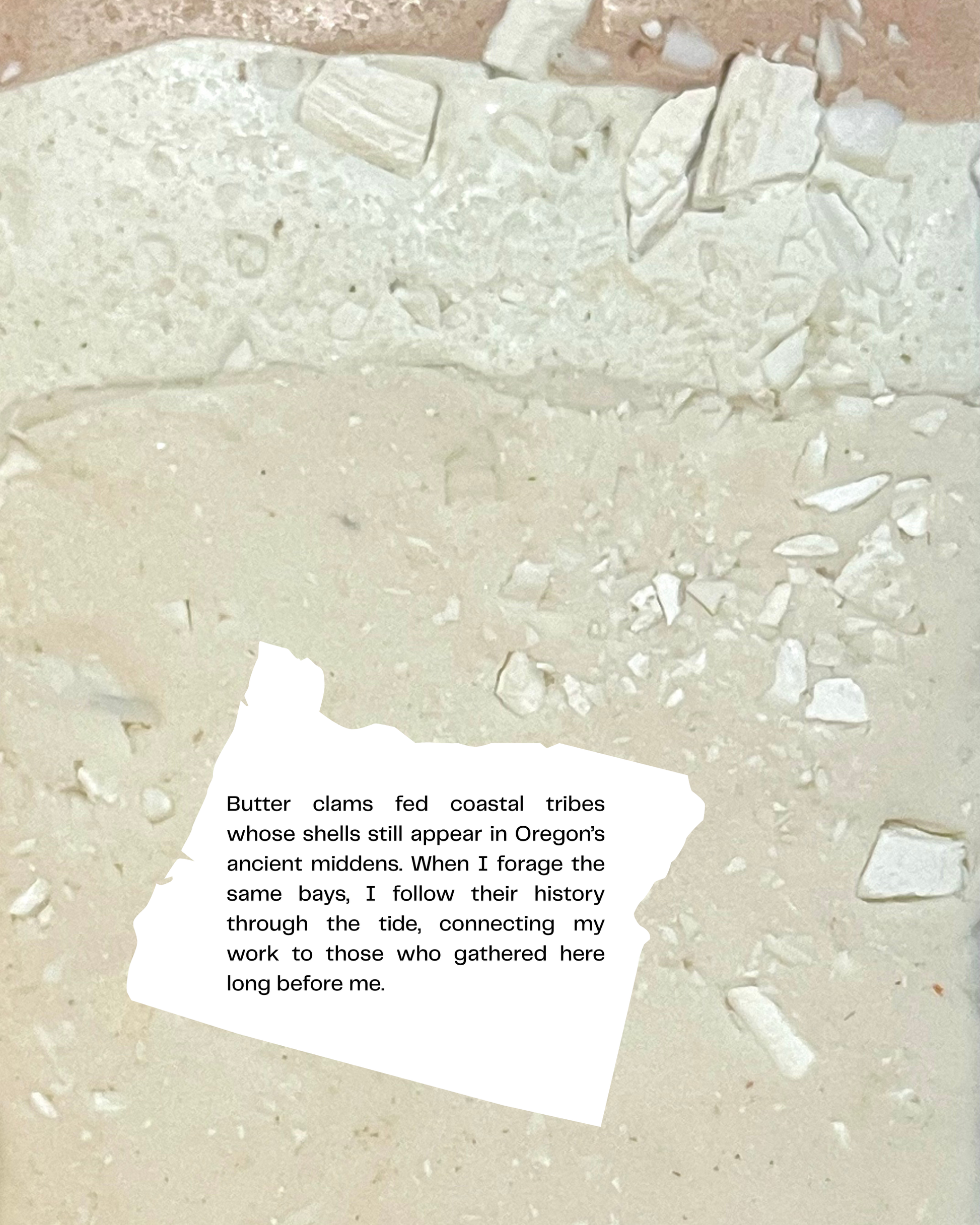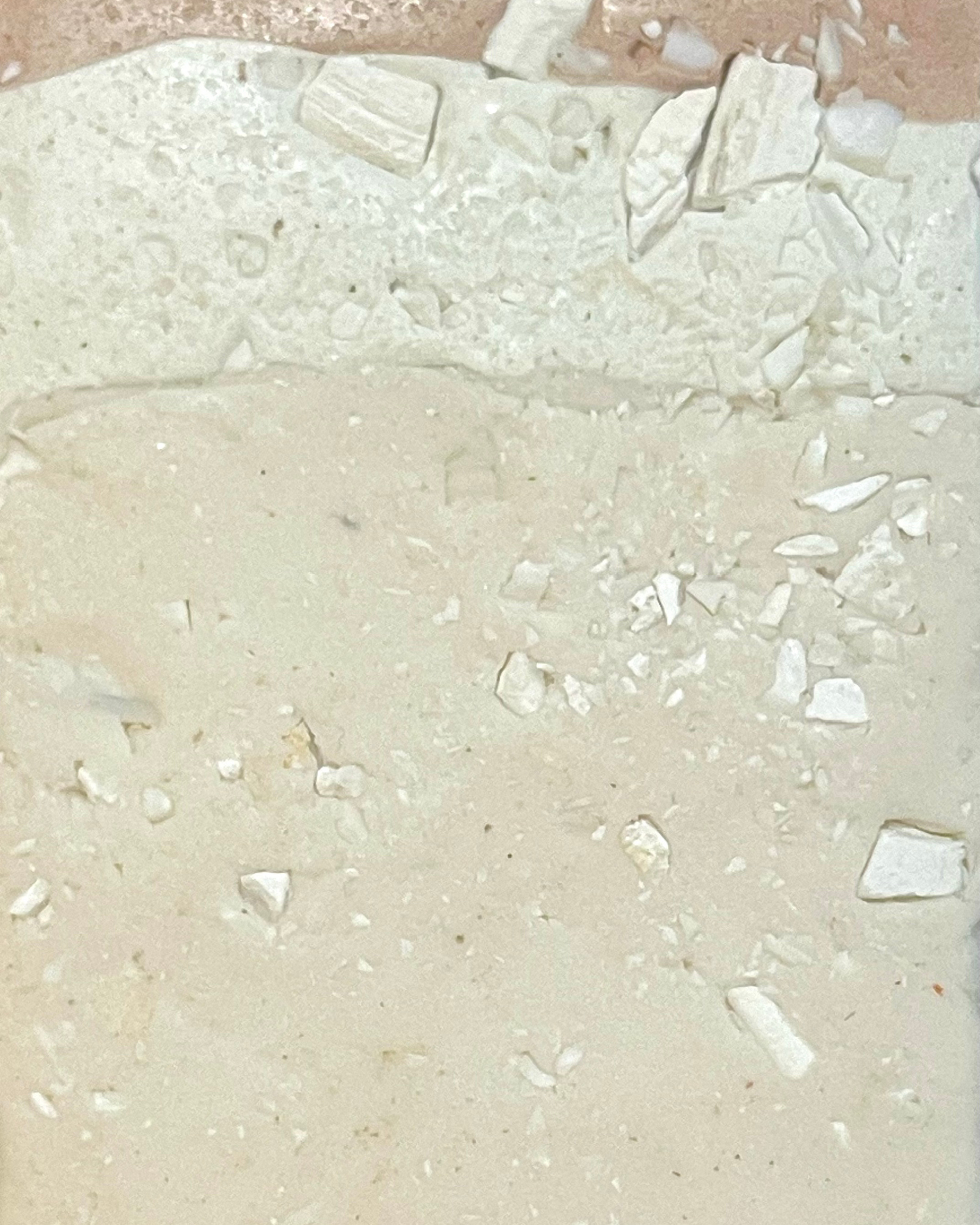 The clay is made with a blend of translucent Sculpey III, iron oxides for pigmentation, and natural pigmented fragments that were hand foraged and processed.