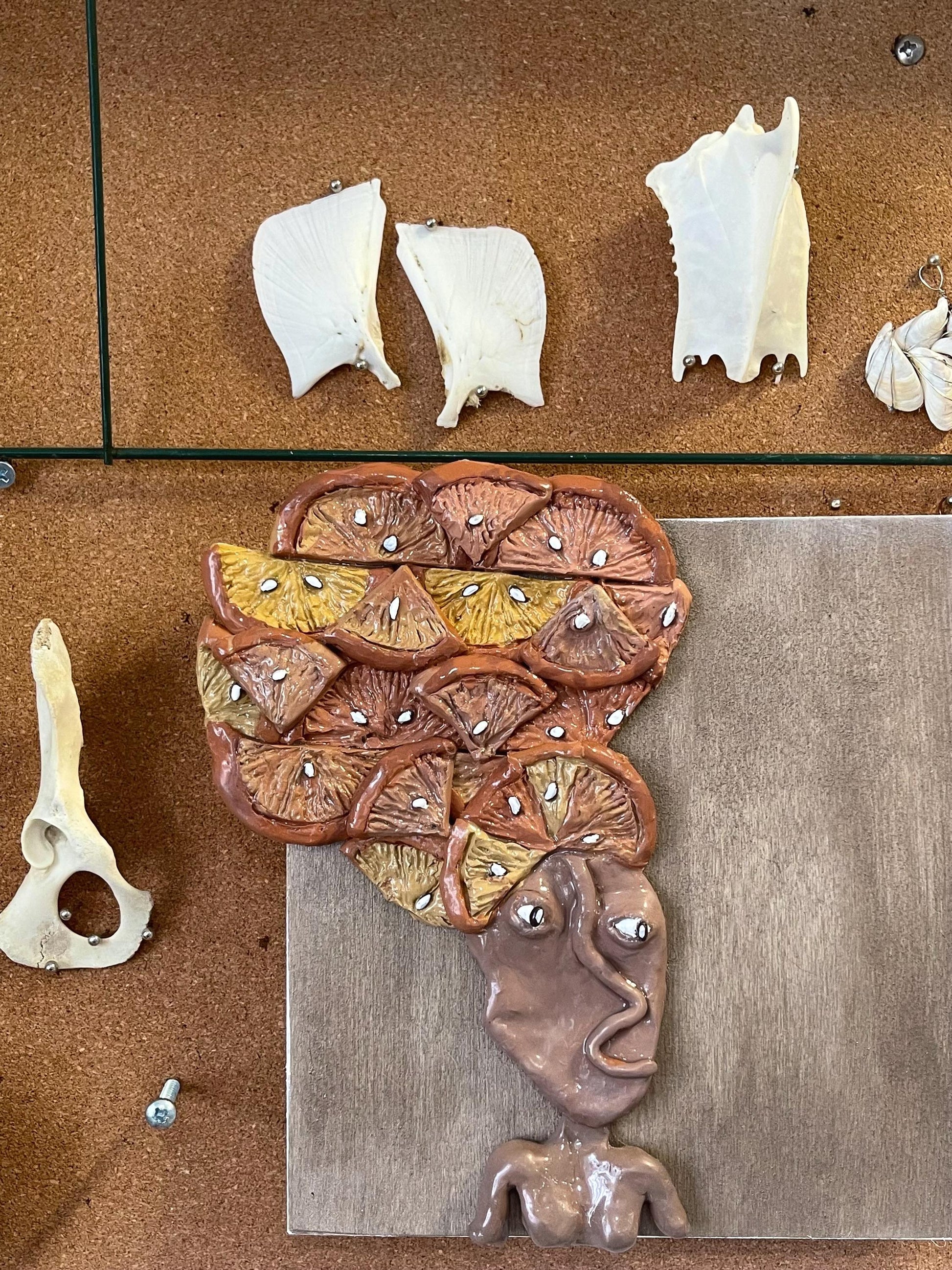 The clay is made with a blend of translucent Sculpey III, iron oxides for pigmentation, and natural pigmented fragments that were hand foraged and processed.