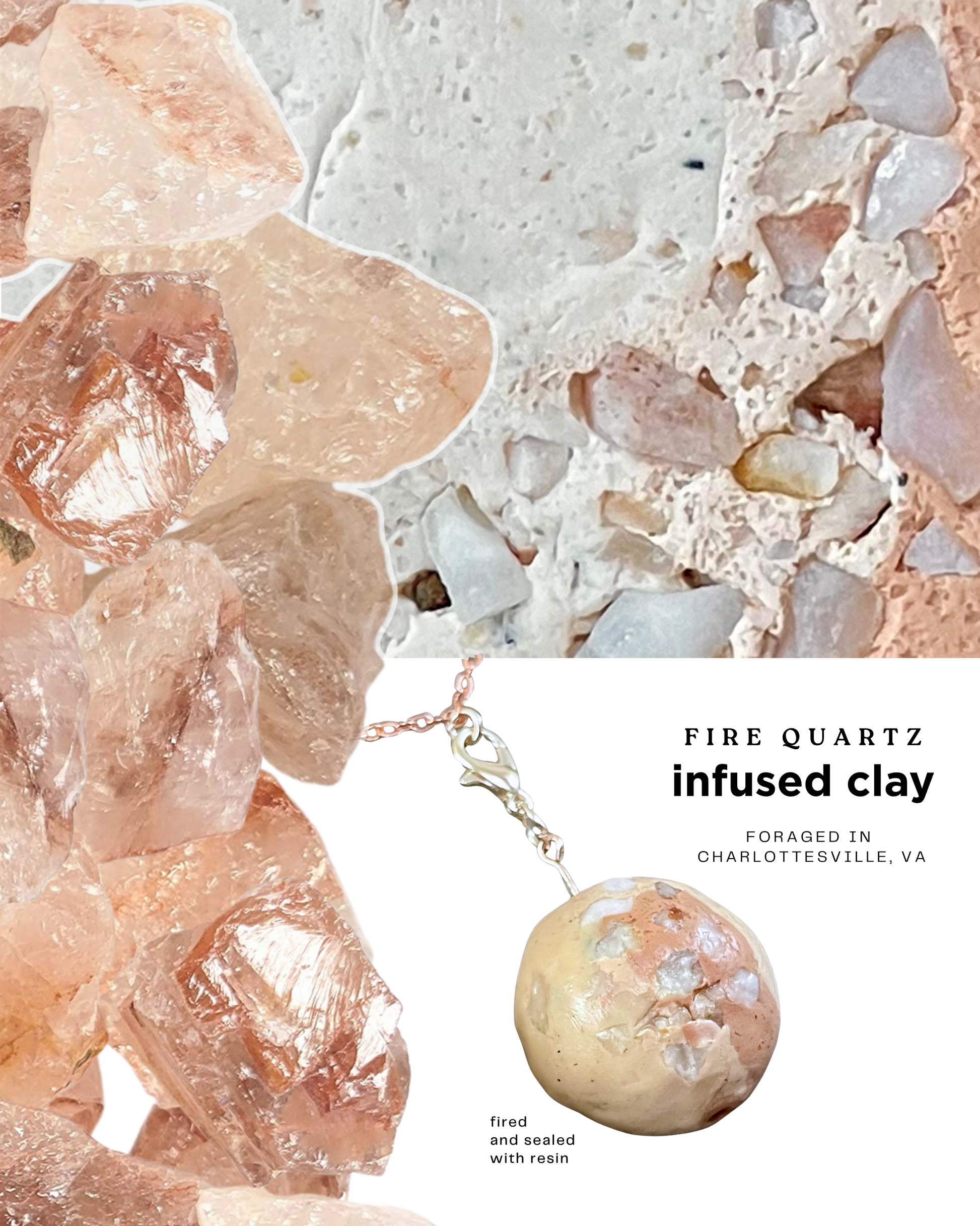 The clay is made with a blend of translucent Sculpey III, iron oxides for pigmentation, and natural pigmented fragments that were hand foraged and processed.