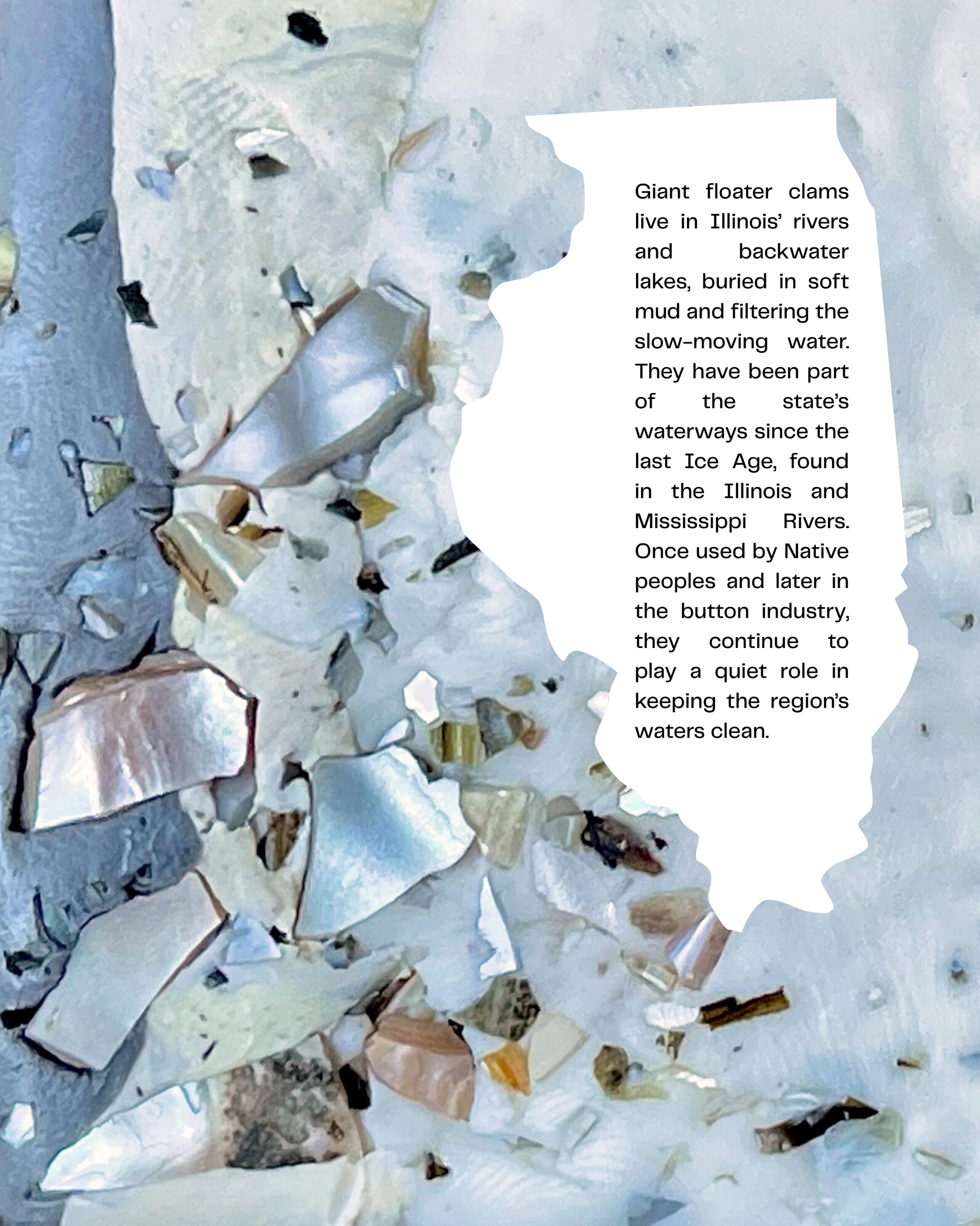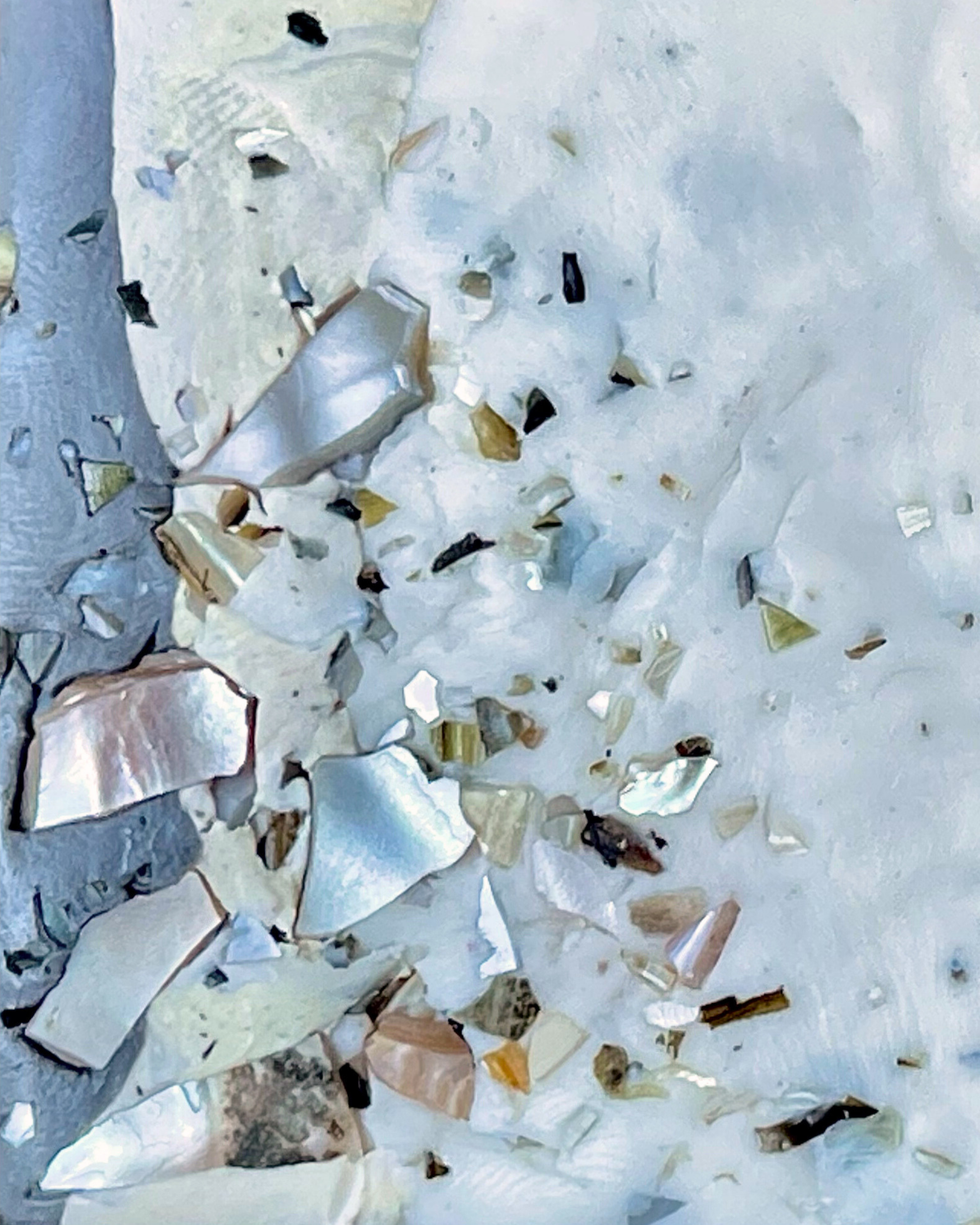 The clay is made with a blend of translucent Sculpey III, iron oxides for pigmentation, and natural pigmented fragments that were hand foraged and processed.