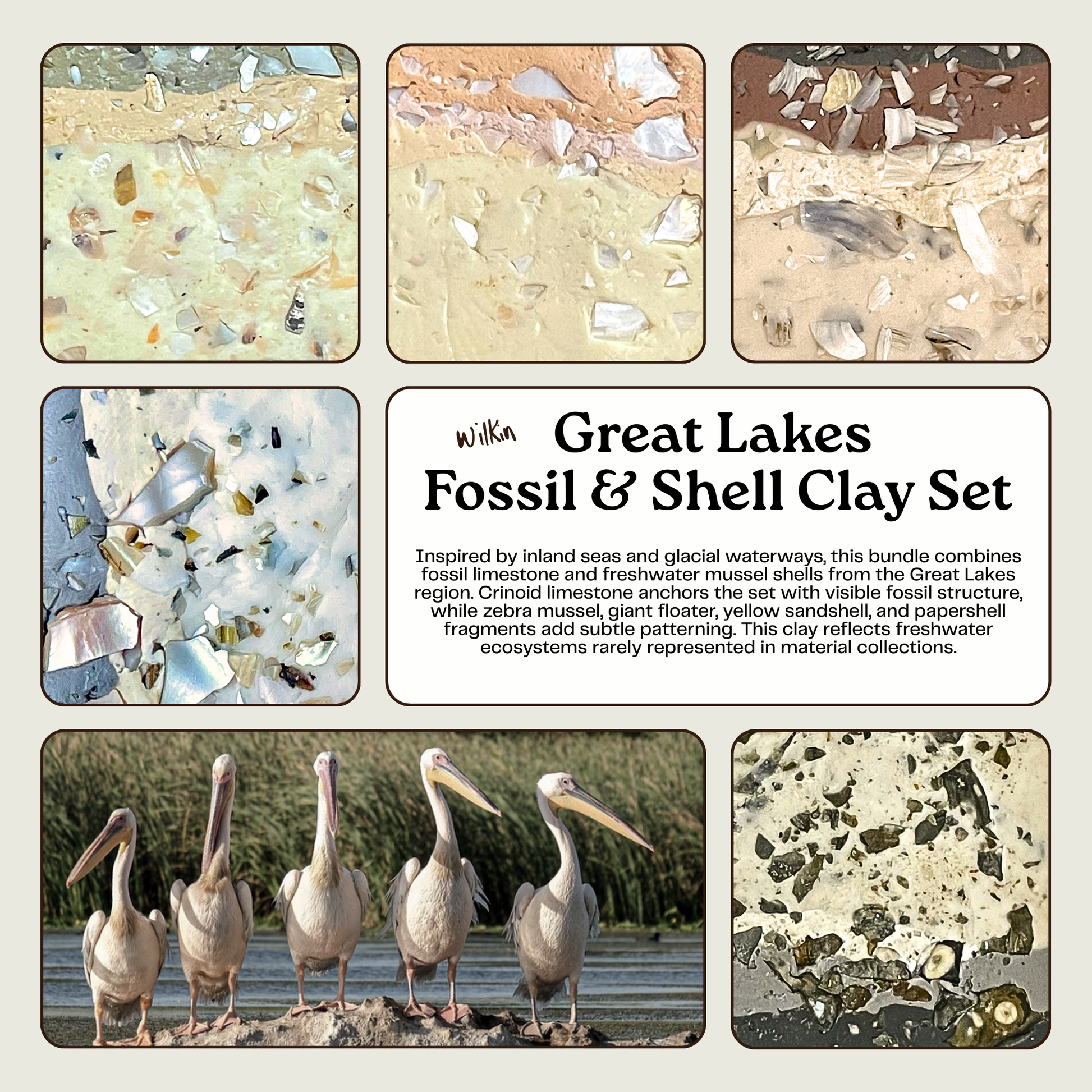 Inspired by inland seas and glacial waterways, this bundle combines fossil limestone and freshwater mussel shells from the Great Lakes region. Crinoid limestone anchors the set with visible fossil structure, while zebra mussel, giant floater, yellow sandshell, and papershell fragments add subtle patterning. This clay reflects freshwater ecosystems rarely represented in material collections.