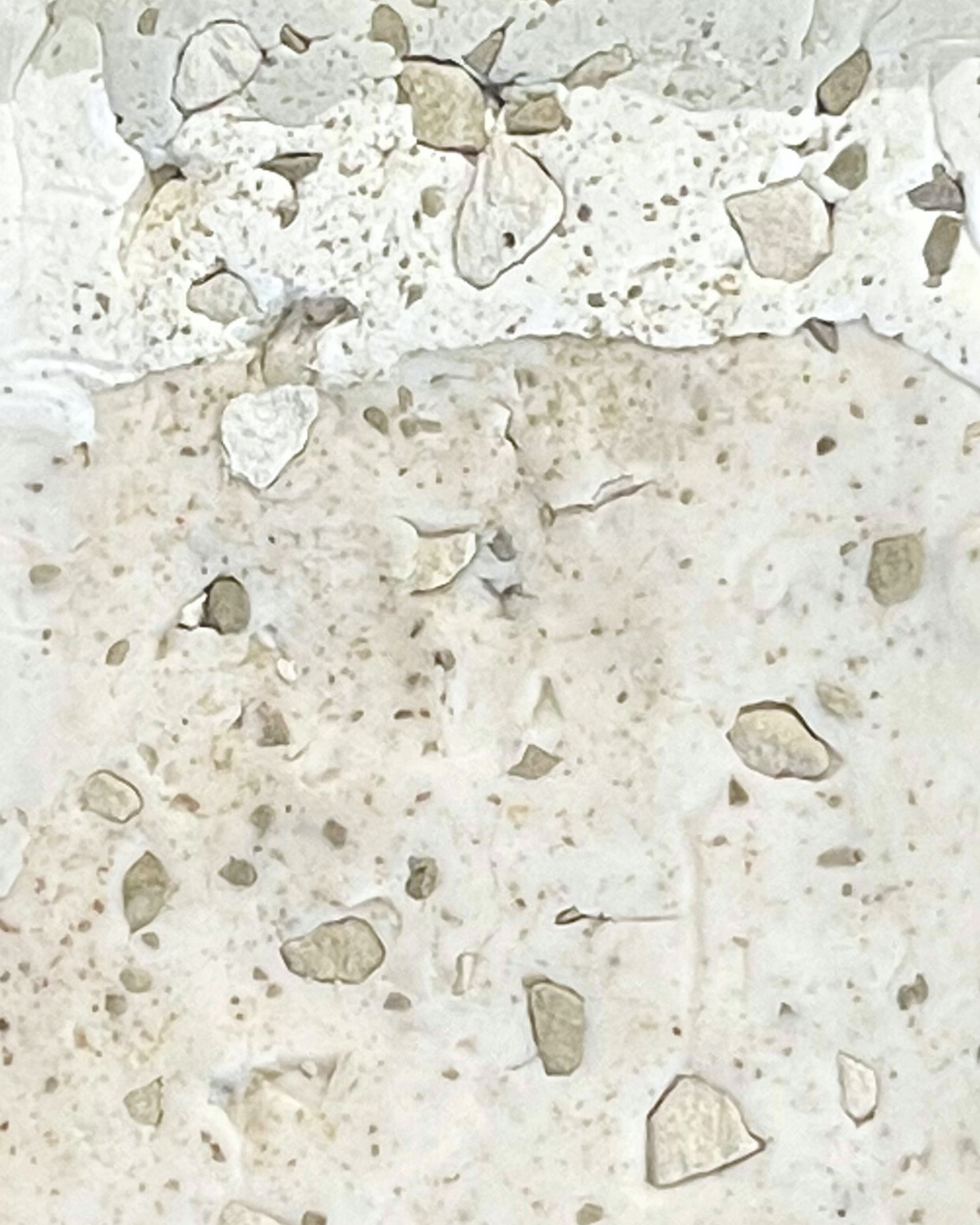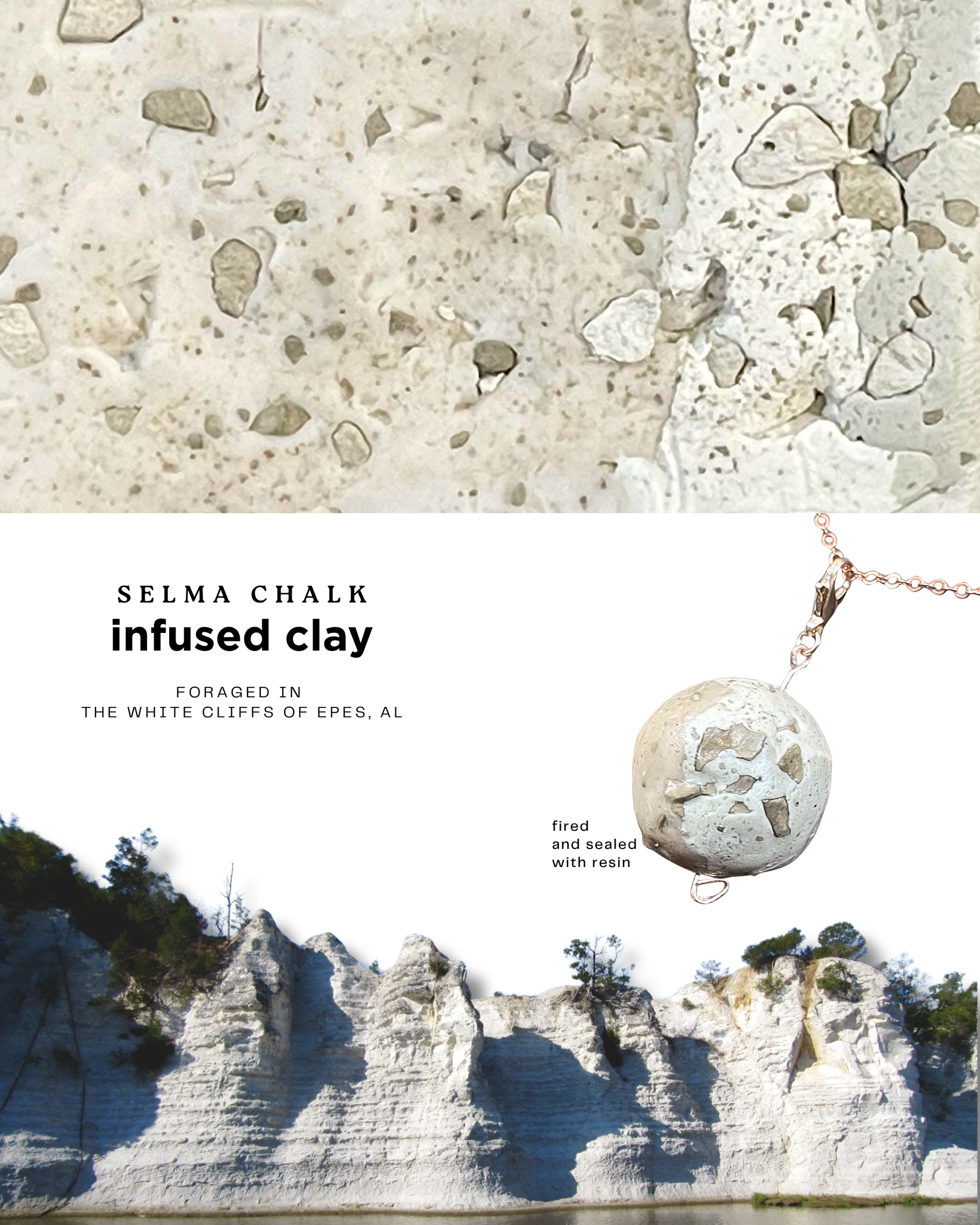 The clay is made with a blend of translucent Sculpey III, iron oxides for pigmentation, and natural pigmented fragments that were hand foraged and processed.