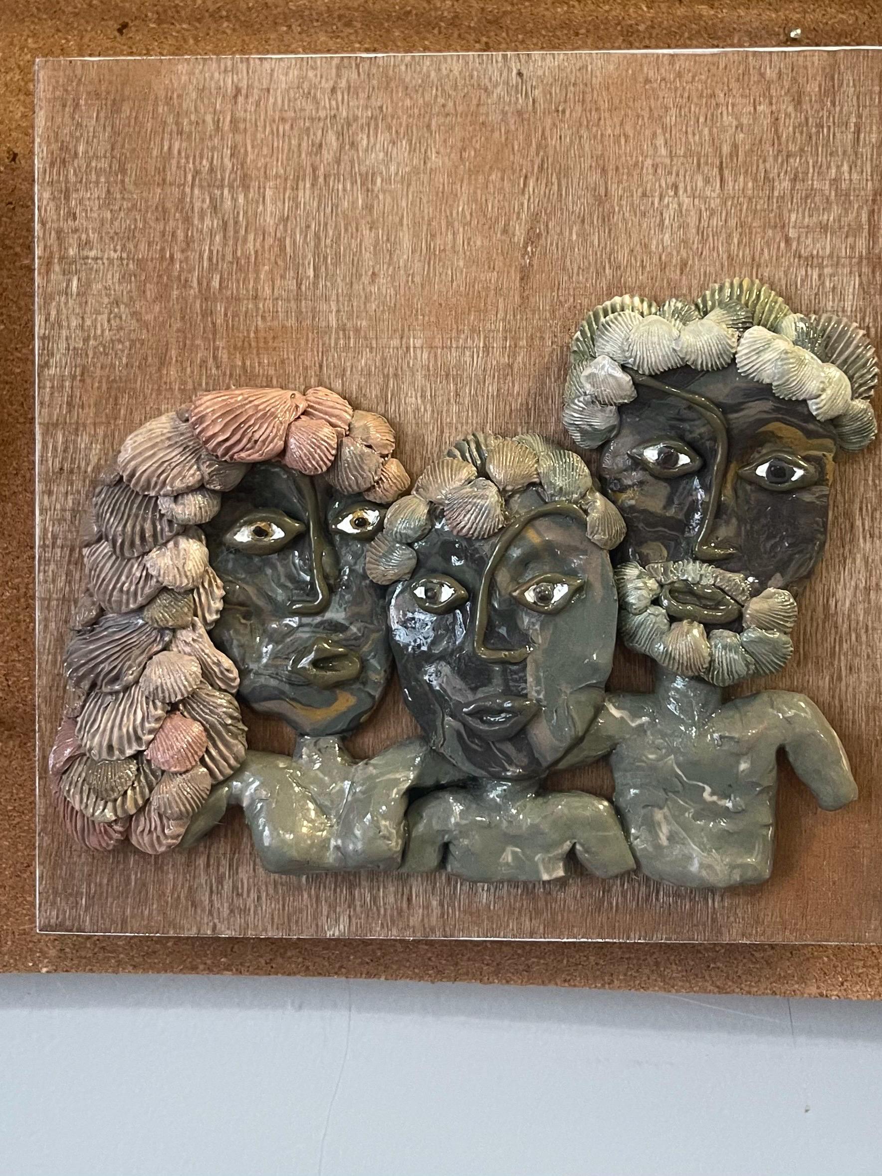 Meet the Clams - family of 3 portrait, wall relief sculpture, mom dad and child family