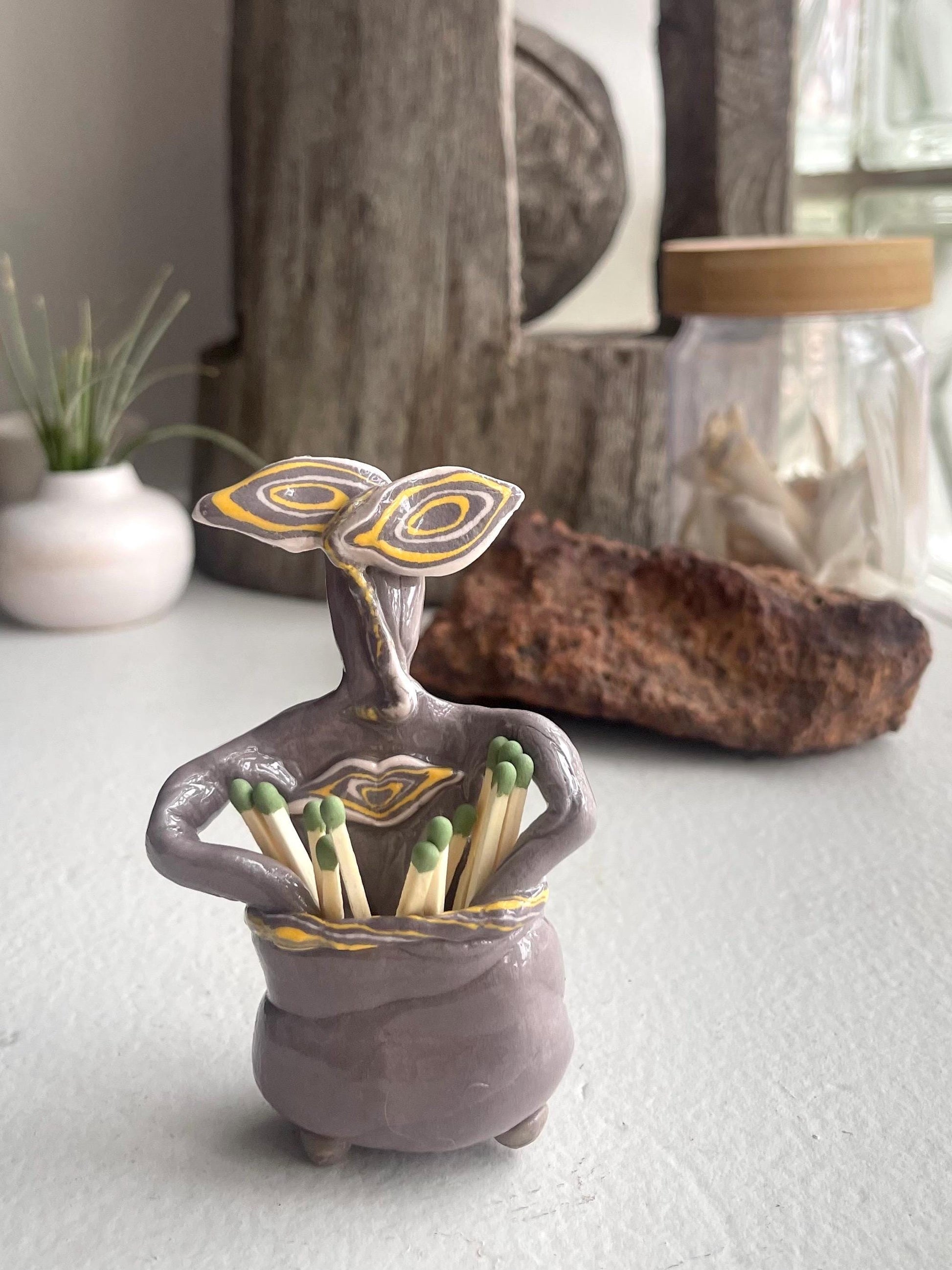 The clay is made with a blend of translucent Sculpey III, iron oxides for pigmentation, and natural pigmented fragments that were hand foraged and processed.