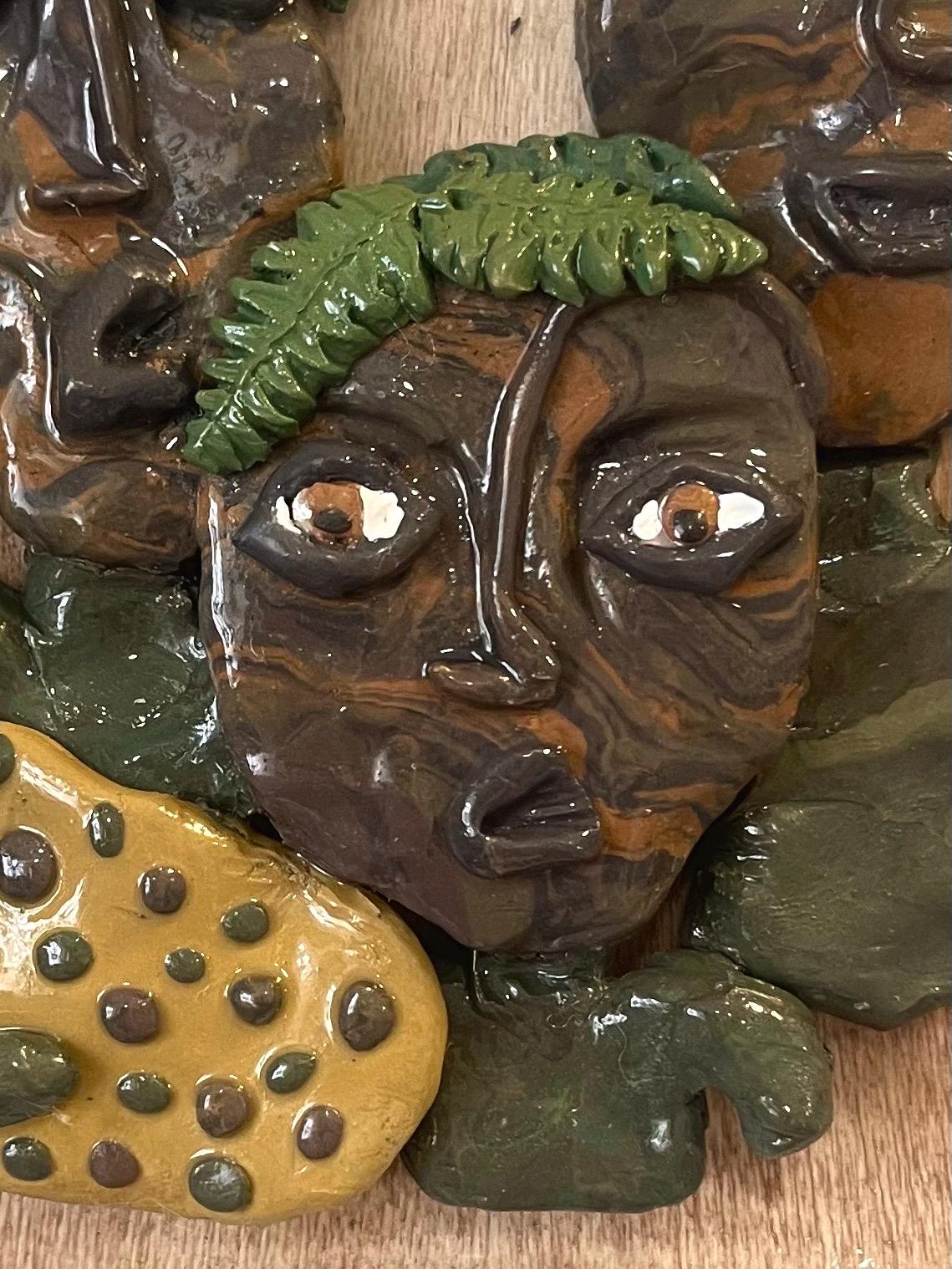 The clay is made with a blend of translucent Sculpey III, iron oxides for pigmentation, and natural pigmented fragments that were hand foraged and processed.