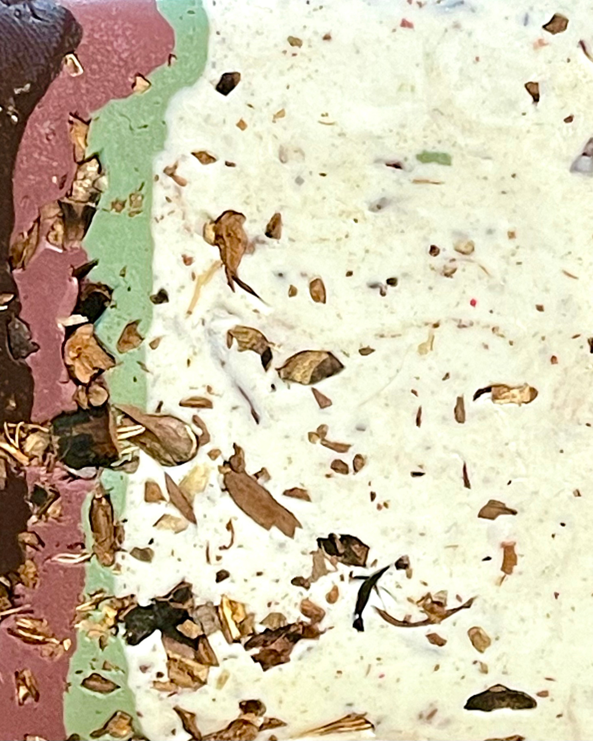 The clay is made with a blend of translucent Sculpey III, iron oxides for pigmentation, and natural pigmented fragments that were hand foraged and processed.