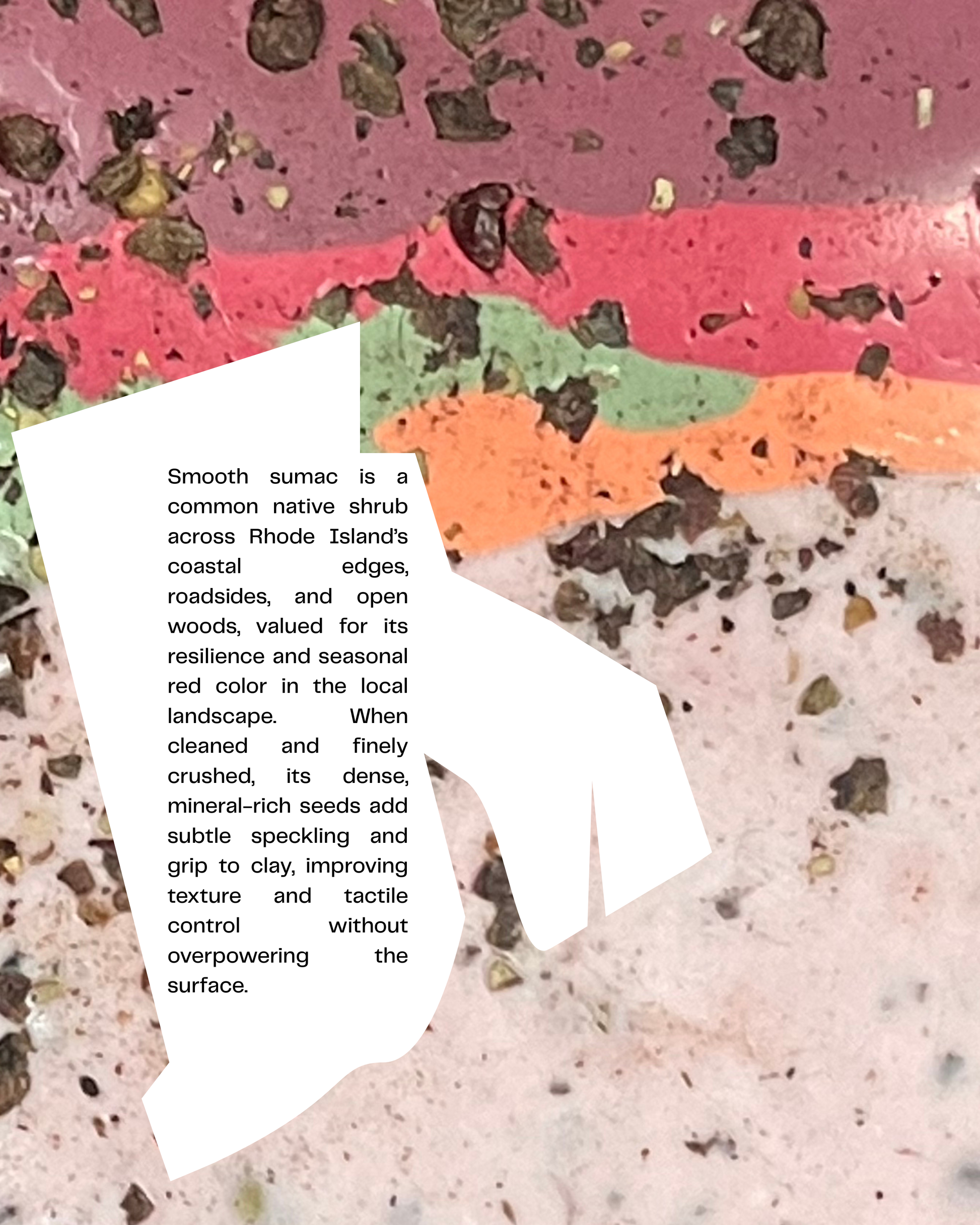 The clay is made with a blend of translucent Sculpey III, iron oxides for pigmentation, and natural pigmented fragments that were hand foraged and processed.
