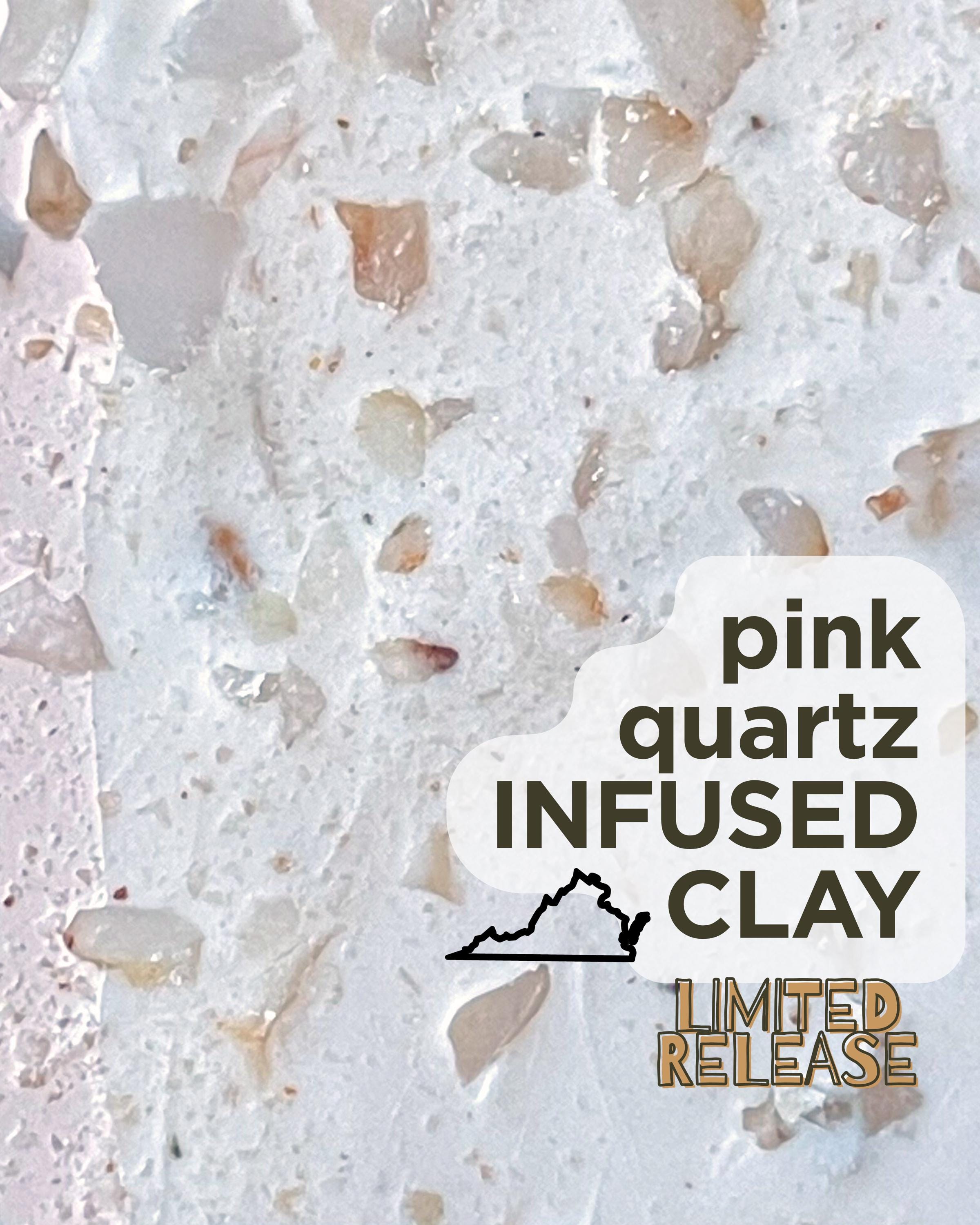 Charlottesville’s geology includes quartz-rich formations where iron and mineral inclusions create delicate rose and pink tones. The fragments bring a gentle sparkle with blush-colored flecks, grounding this clay in the mineral history of Virginia’s Piedmont.
