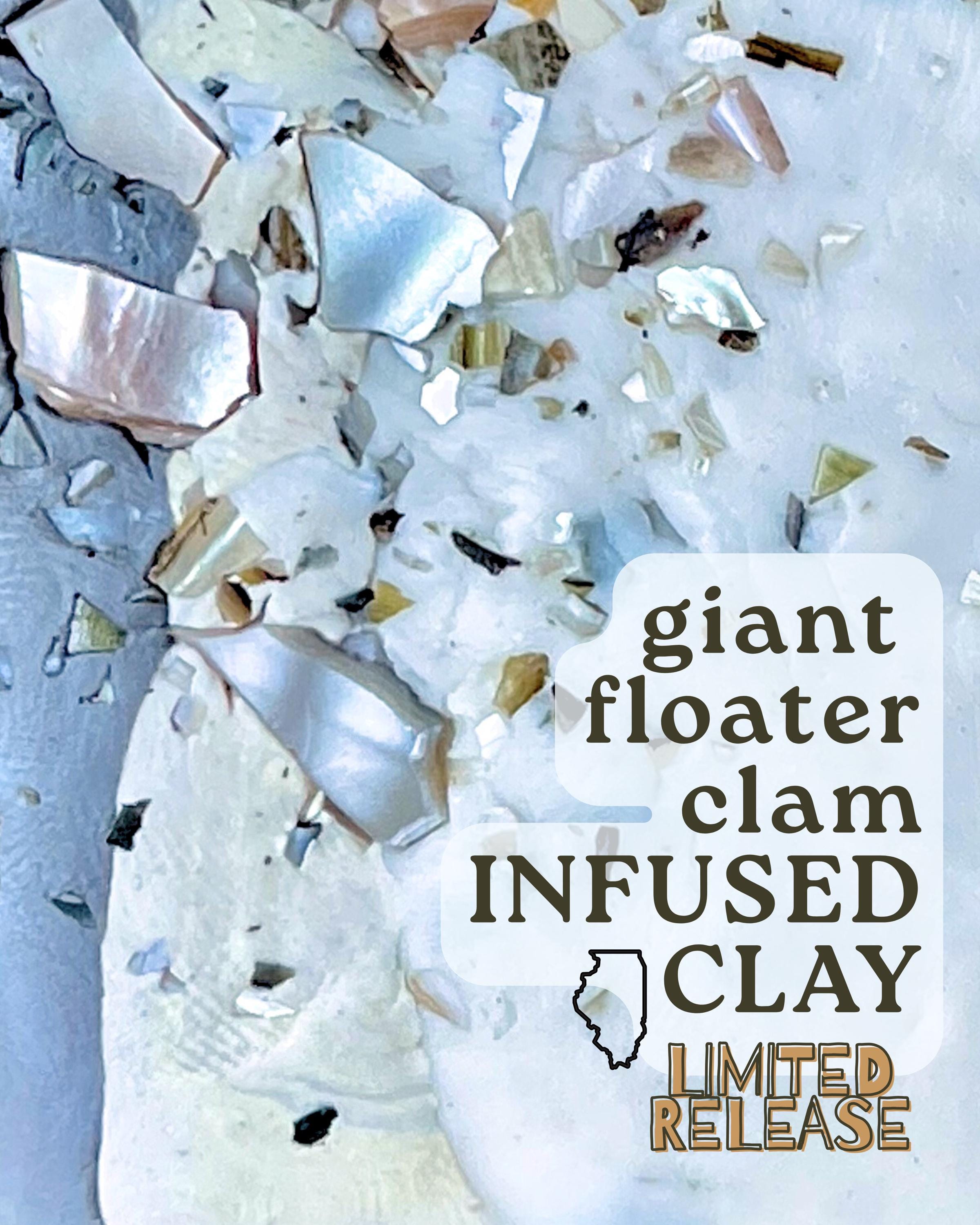 This Giant Floater Shell Clay is a blend of Sculpey III with fragments of freshwater mussel shell collected near Chicago, Illinois. Once part of living riverbeds, these shells now lend their shimmer and texture to a sculptural medium.