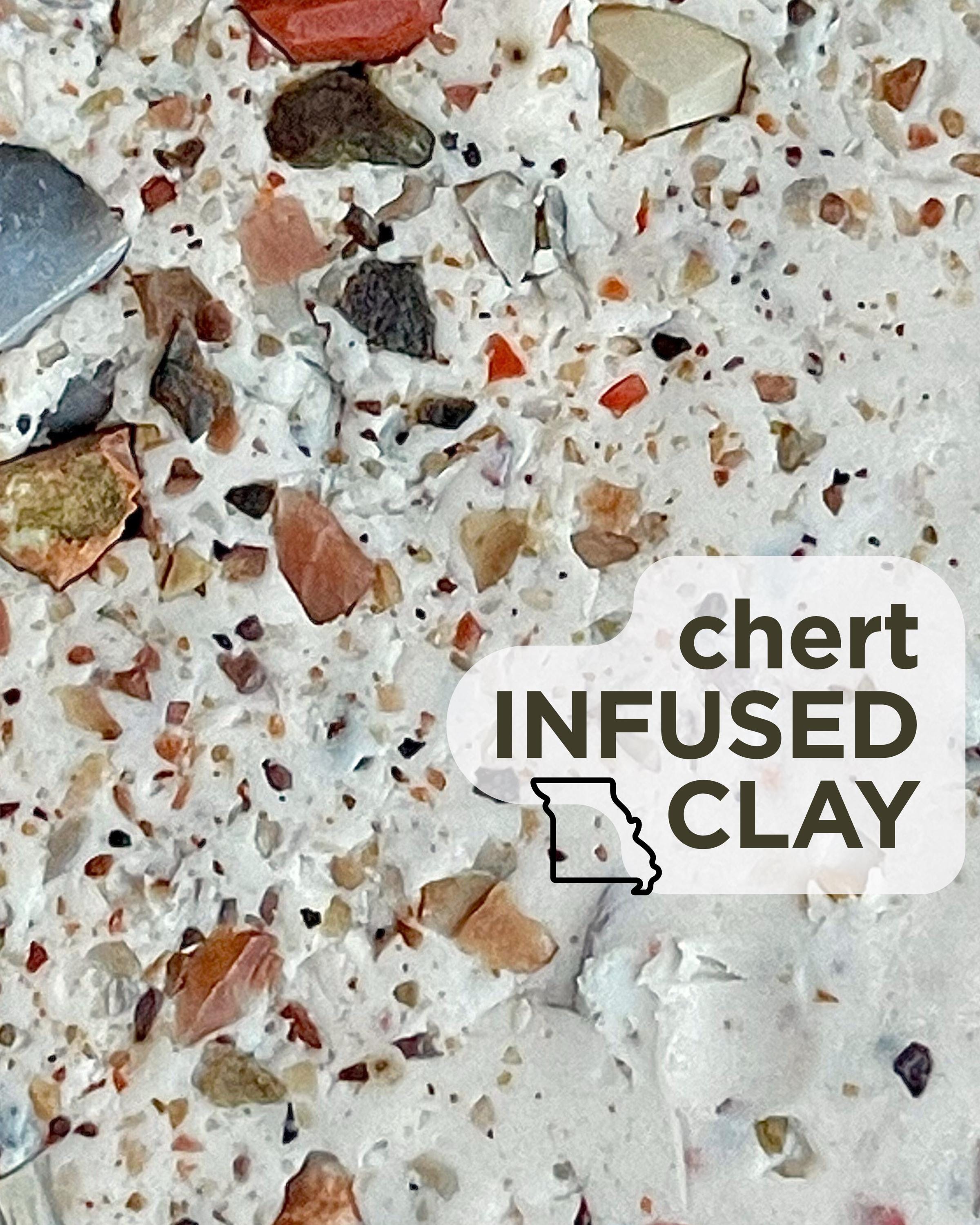 The Ozarks are home to abundant chert outcrops, formed from marine deposits over millions of years. These fragments bring rugged textures, earthy reds, greys, and tans, grounding this clay in both geologic history and human heritage.